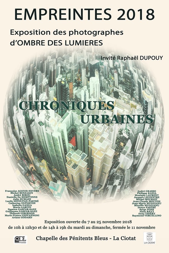 EMPREINTES 2018 3Chroniques Urbaines"Photographe invité : Rapahël DupouyLes membres du club photo Ombre des Lumières exposent du 7 au 25 nov 2018Chapelle des Pénitents Bleus - La Ciotat